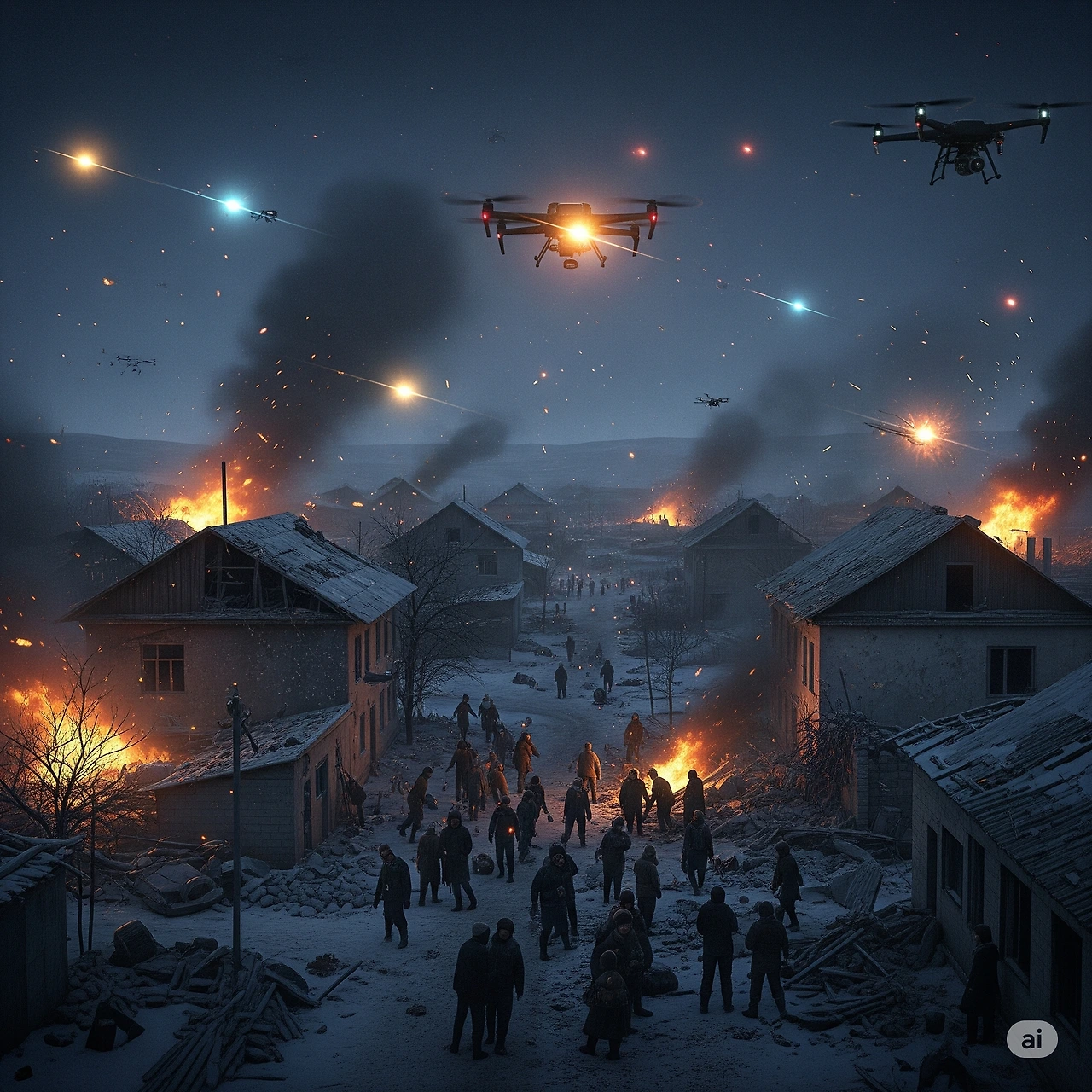 컴컴한 밤 춥디 추운 계절 하늘의 드론들이 날아 오가며 번쩍이고 마을들 아수라장 되었네(전쟁)