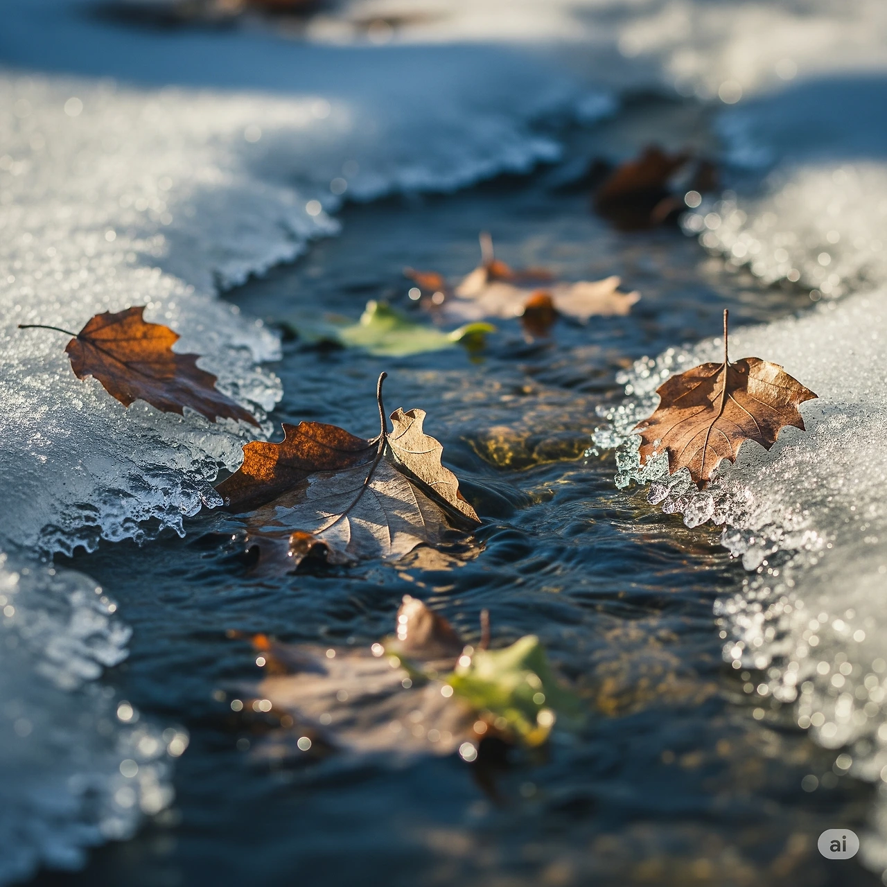 Water flows within the ice, and faded fallen leaves, having endured the past seasons, also journey.