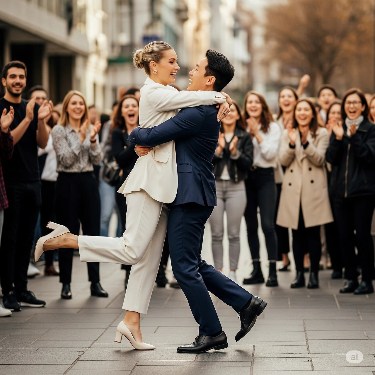 많은 사람들 앞에서 달려와 점프 깜짝 놀라 안게 되네본 사람들 놀라 손뼉 치고 환영하네