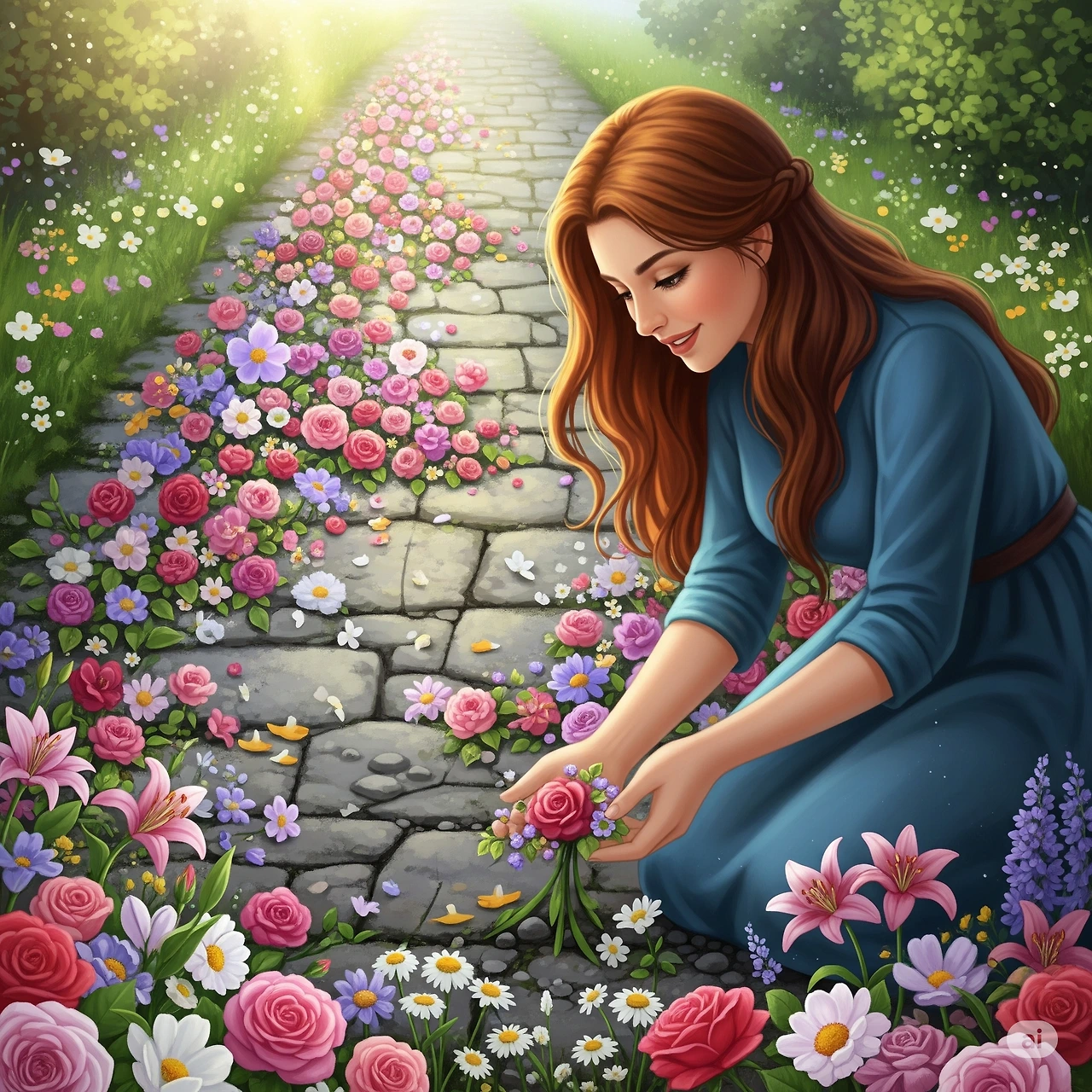 님 떠난 거친 돌길언제 오실런지 모르겠네돌아오실 님즈려밟고편안하고 행복하게 오시라고매일같이길가엔 꽃들을 피우게 하리