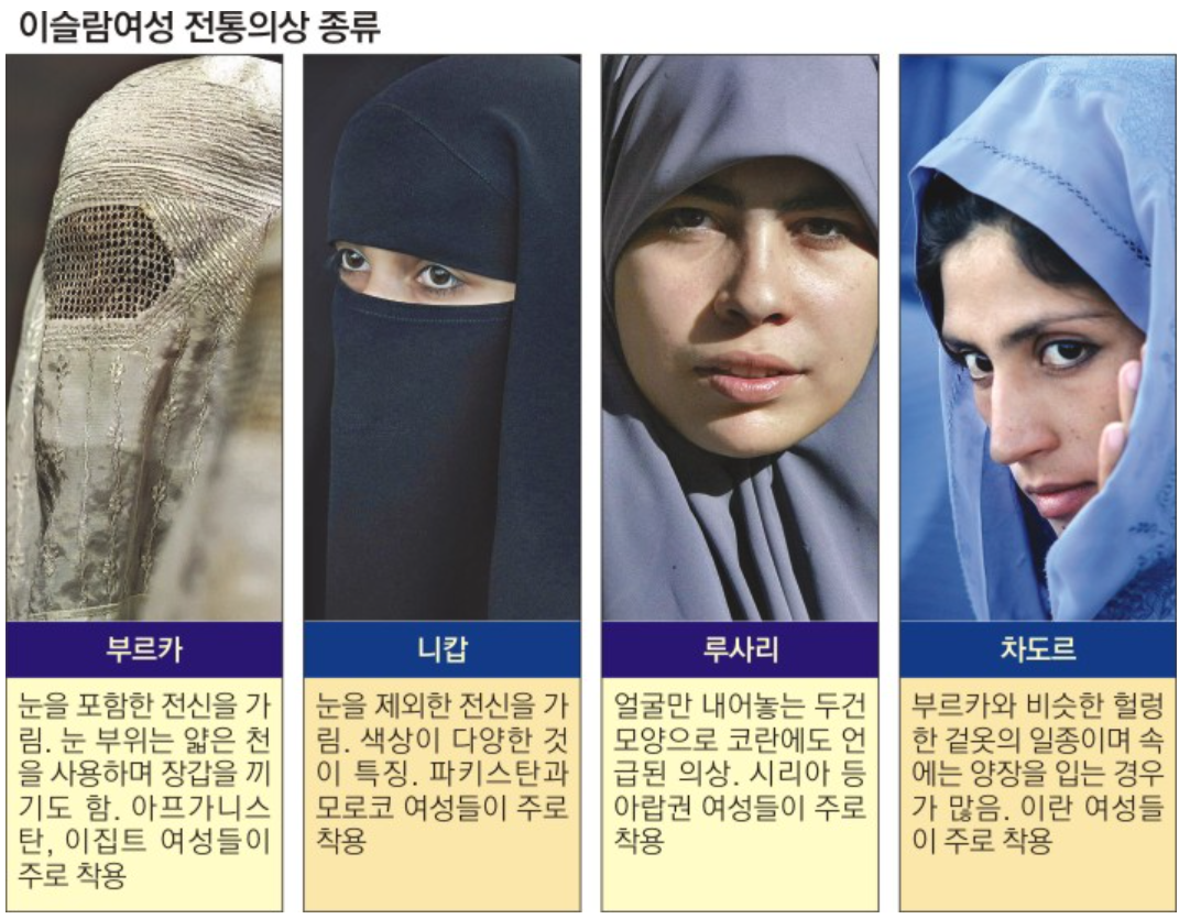 "그런데 왜 여자들만 히잡과 니캅을 쓰는 거야? 남자들은 안 그러잖아."