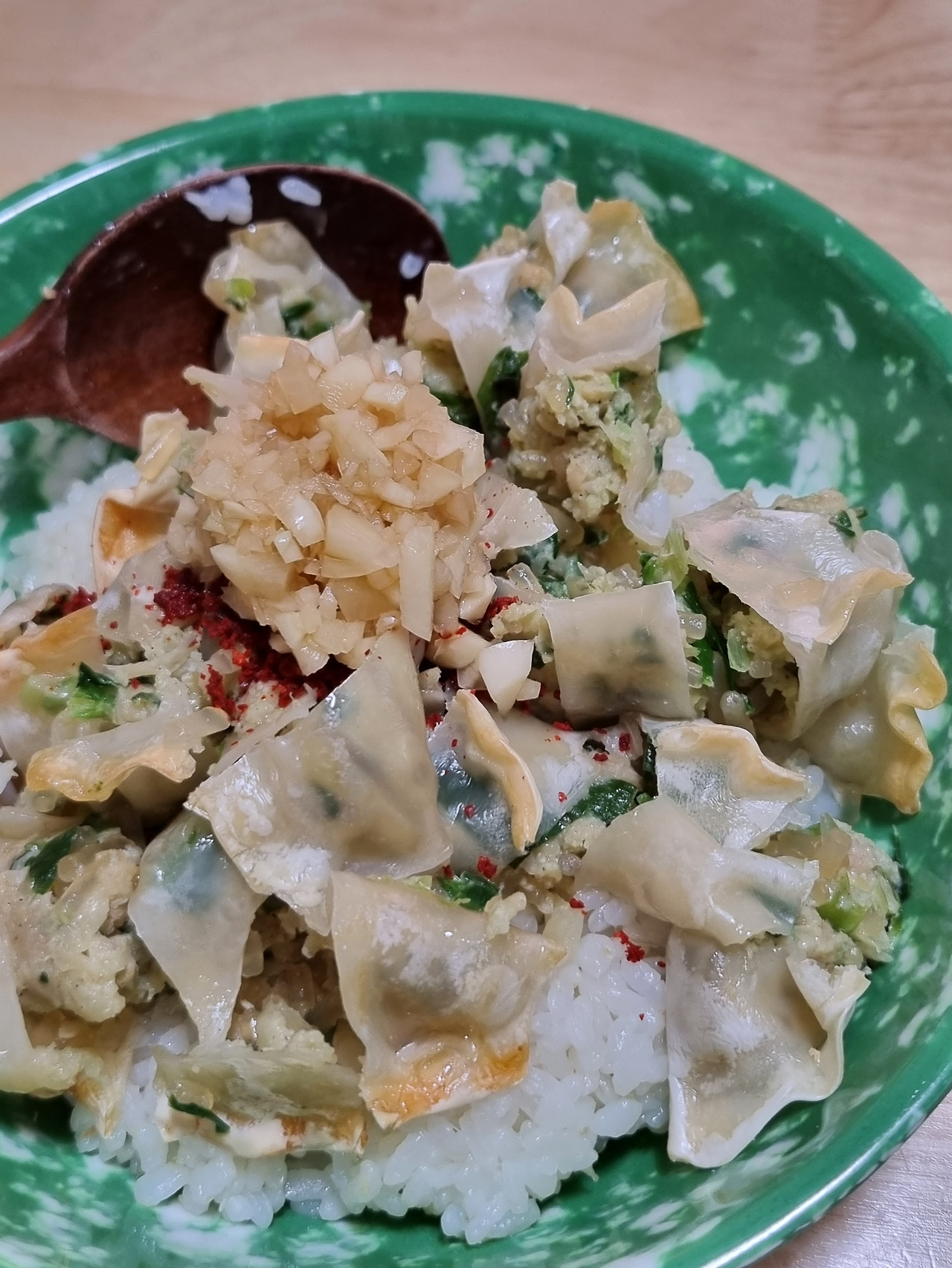 유학 시절 최애 소울 푸드였던 만두밥, 고춧가루와 마늘 장아찌를 토핑으로 올려 먹으면 얼~마나 맛있게요?