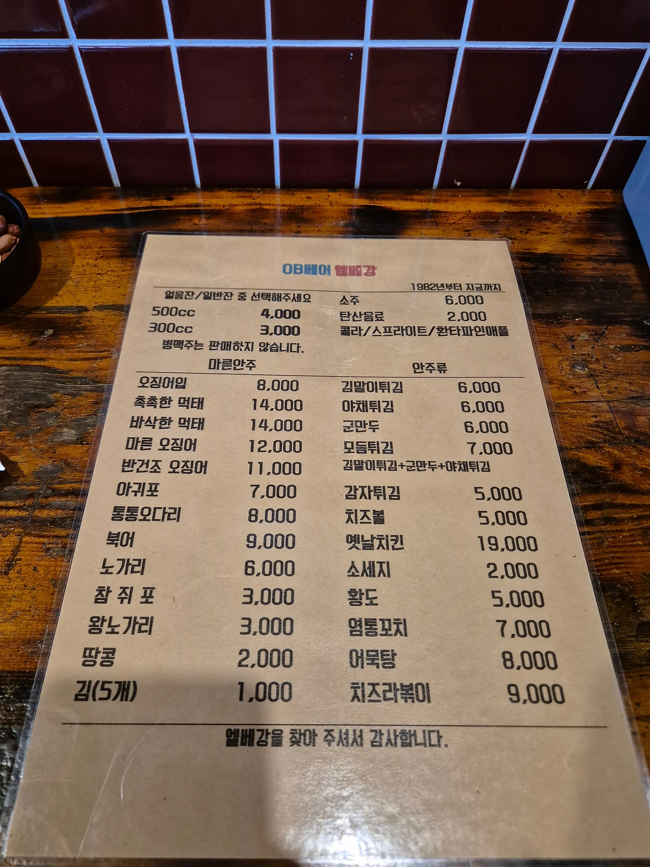 처음부터 이 술집을 노리고 익산을 향한 것은 아니었다. 하지만 일단 기차에 타고나서부터 부리나케 검색을 할 때 한 번은 역전할맥 본점이 익산에 있다는 글을 읽었고 그런가 보다 했지만 막상 "역전할맥 본점"을 검색했더니 나오는 가게는 없었다. 이게 뭐지..? 할 때쯤 택시기사님께서 엘베강을 추천해 주셨다. 역전할맥의 원조라고 말씀하시며...