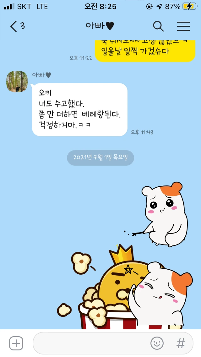 약 2달이 지난 지금은 제법 능숙하게 운전을 한다. 옆좌석에 잔소리쟁이 한 명 태우고 다니느라 정신적으로 피곤하긴 하지만 다 우리의 안전을 걱정해서 하는 소리려니 하고 위안을 삼아 본다. 잔소리쟁이도 어서 빨리 운전을 배워서 나의 부담을 좀 나눠줬으면 좋겠다.(보고 있지?) 왜냐하면 운전이 생각보다 피로가 많이 쌓이기에 부부가 둘 다 운전을 할 수 있다면 나중에 아이가 있을 시 분명 더 좋을 테니 말이다. 동생도 최근에 운전 연습을 시작했는데, 본인 차는 따로 없어서 아빠 차로 연습을 하고 있다. 잘하고 있다는 소리는 들었는데 최근에 아파트 지하주차장 올라가다가 박았다고 한다. 자식들 교육시키느라 아빠가 고생이 많다. 아빠 파이팅 ♡