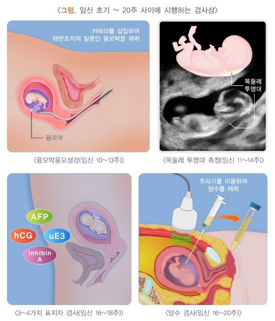 임신 초기에 하는 다양한 검사들은 기형아 검사라고 하기보다는 '다운증후군 산전검사'라고 부르는 것이 맞다. 주로 염색체 수 이상으로 인해 생기는 질환을 타겟으로 하며, 그중에서도 다운증후군을 주요 타겟으로 검사하기 때문에 '다운증후군 산전검사'라고 부르도록 하자.