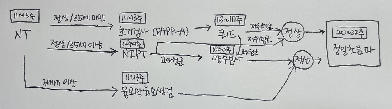 태아 목덜미 투명대 검사(NT검사, 선별검사) → 비침습적 태아 염색체 이상 검사(혈액검사, 선별검사) → 침습적 태아 염색체 이상 검사 (융모막융모생검/양수검사, 확진검사)