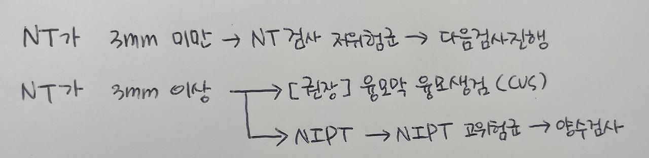 NT가 두껍게 나온 경우 융모막융모생검을 권유하고, NIPT나 2차 혈액검사까지 진행하여 고위험군이 나온 경우 양수검사를 진행한다. 내가 다니는 병원은 융모막융모생검을 하지 않는 병원인데, 필요한 경우 더 큰 여성병원이나 대학병원에서 검사를 진행할 수 있다.