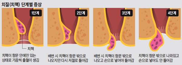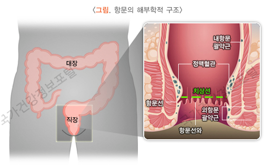 치핵: 항문의 안쪽과 바깥쪽에 '정맥 다발'이 있는데, 이 정맥 다발에서 발생하는 혈관 질환
