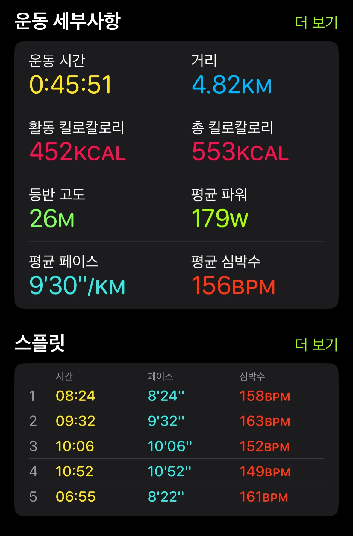 평균 페이스가 1km당 9분 30초다. 환산하면 러닝머신 6.3km/h로 놓고 뛰었단 얘기니까, 사실상 조금 빨리 걸은 거나 마찬가지다. 하지만 안타깝게도 나는 확실히 뛰었고, 평균 심박수가 156 bpm이나 나왔다. 이 정도가 지금 나의 저질스러운 체력이라고 볼 수 있겠다.