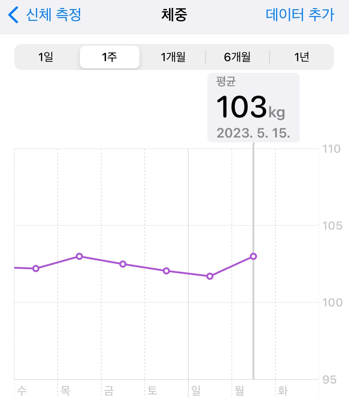 11일 차 체중 : 103kg (3일 전보다 +0.5kg / 목표 체중까지 23.9kg 남음)