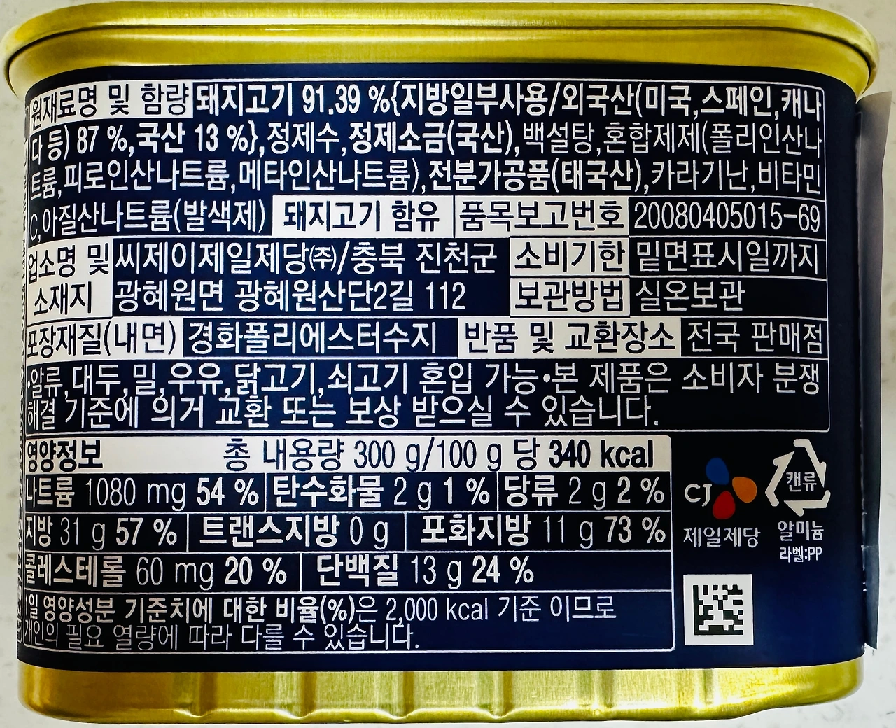 300g에 1,020kcal다. 스팸의 약 100g 정도는 지방이기 때문에, 여기서 거의 900kcal에 달하는 열량을 담당한다. 그리고 놀랍게도 탄수화물의 총량은 6g, 물론 이 6g은 100% 단순당이다. 스팸 제조과정을 상세히 알지는 못하지만, 아마 돼지고기에서 발생한 당류가 아닌, 조미 과정에서 들어간 당류일 것이다. 성분표에 나와있는 백설탕으로 추정한다.
