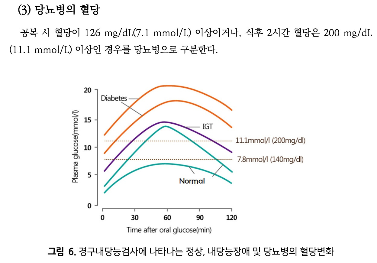 그동안 여러 번 당뇨의 판정 기준에 대해서 언급한 적이 있는데, 오늘은 조금 더 자세하게, 식사 후 시간에 따른 혈당 수치 그래프를 통해 알아보자. 아래 자료는 식약처에서 2019년 6월에 발간한 [건강기능식품 기능성 평가 가이드]에서 발췌한 내용이다.