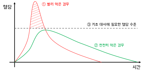 - 천천히 먹어서, 혈당의 상승 속도를 늦춘다.