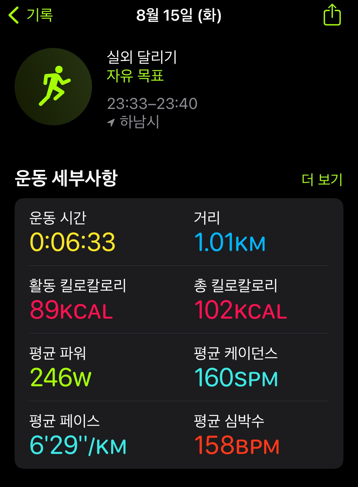 1km를 6분 30초를 걸려서 뛴다. 1.6km를 뛰면 9분 40초가 걸린다는 얘기다. 나는 지금 중학교 1학년, 꼴찌 하던 시절로 다시 돌아와 있다. 그리고 이 글을 쓰게 된 계기인 오늘의 기록은 아래와 같다.