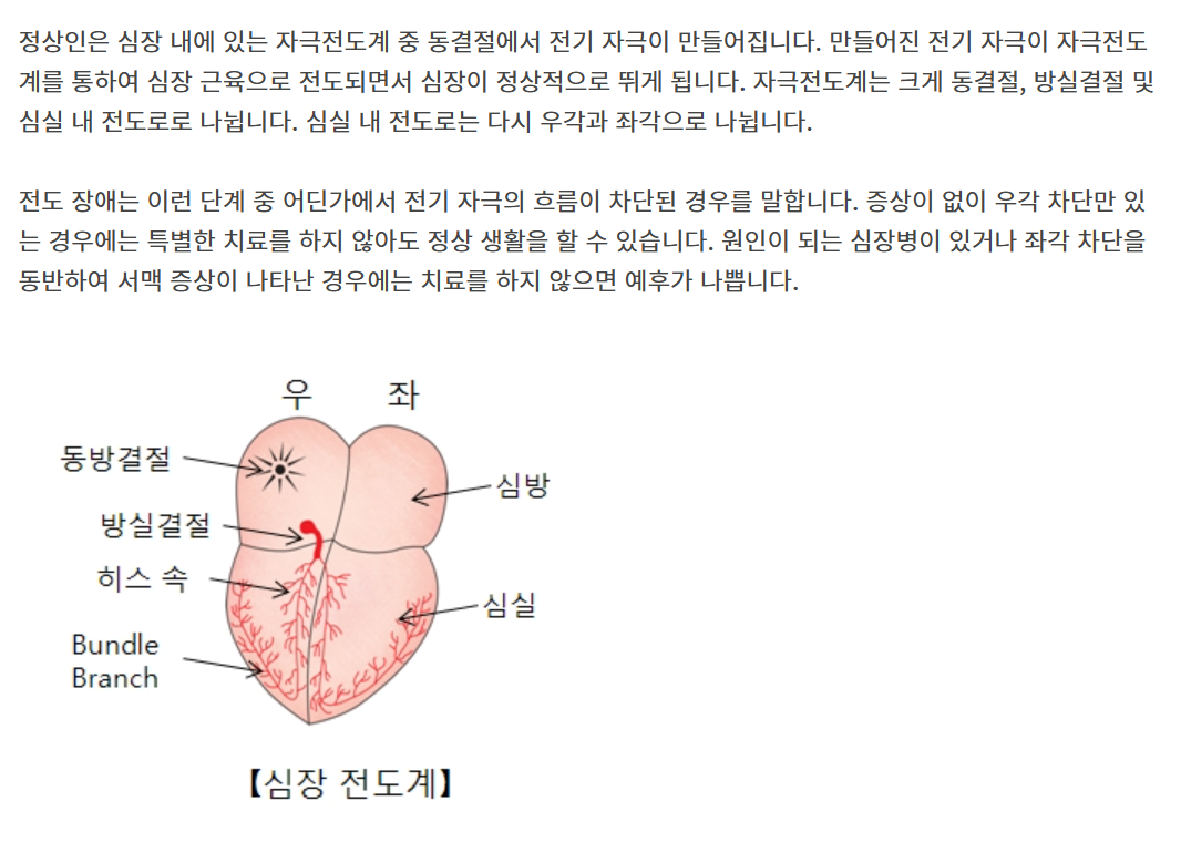 심장에는 심장 박동을 만들어내는 특별한 근섬유가 있다. 학생 때는 동방히푸라고 외웠는데, 동결절 → 방실결절 → 히스속 → 푸르키네 섬유로 이어지는 심장 박동 신호 전달 체계가 있고, 히스속 단계에서 이 섬유는 두 갈래로 나뉘어 각각 좌심과 우심으로 향한다. 이를 각각 좌각, 우각이라고 하는데, 이때 우각으로 박동 신호가 이동하는 것이 차단되는 것을 우각 차단이라고 한다. 우각으로 박동 신호가 안 가도, 좌각으로 간 신호가 곧 우각 쪽도 박동을 일으키기 때문에, 단순한 우각 차단만으로는 문제가 되지 않는다는 것이 서울 아산병원 홈페이지의 설명이다.