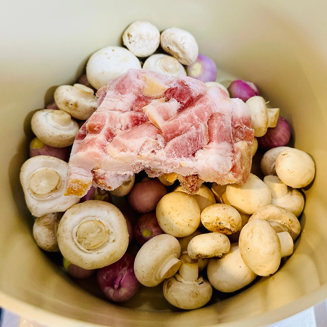 - 샬롯과 양송이버섯, 베이컨을 볶습니다.