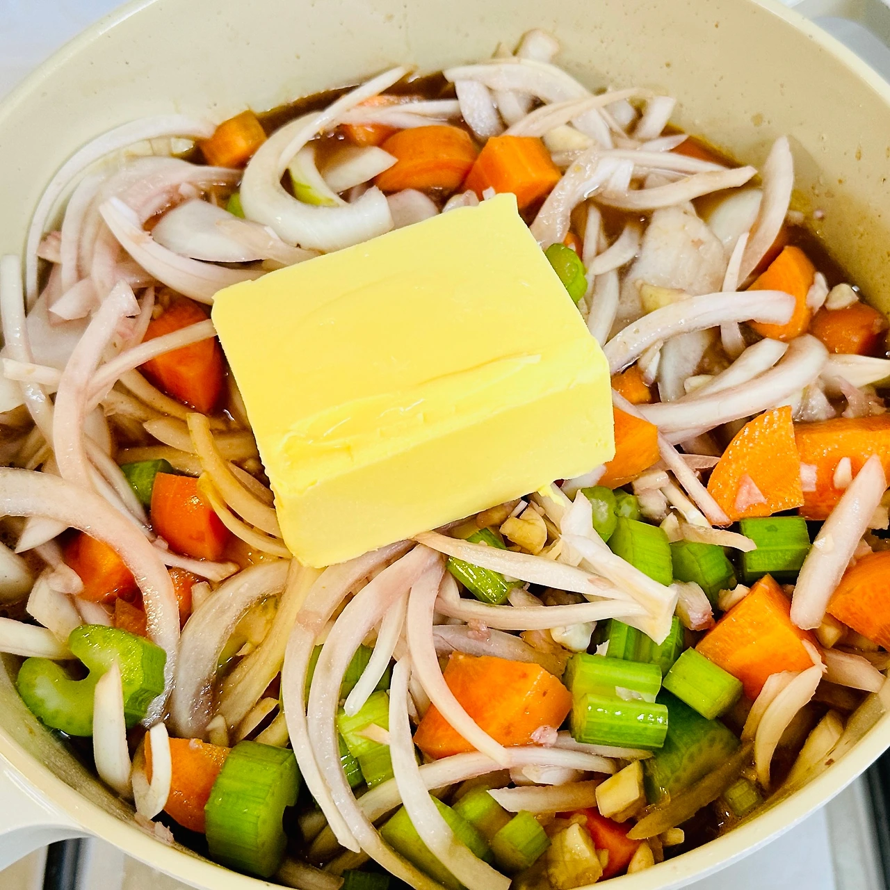 - 여기에 와인에 재어둔 채소를 넣습니다.