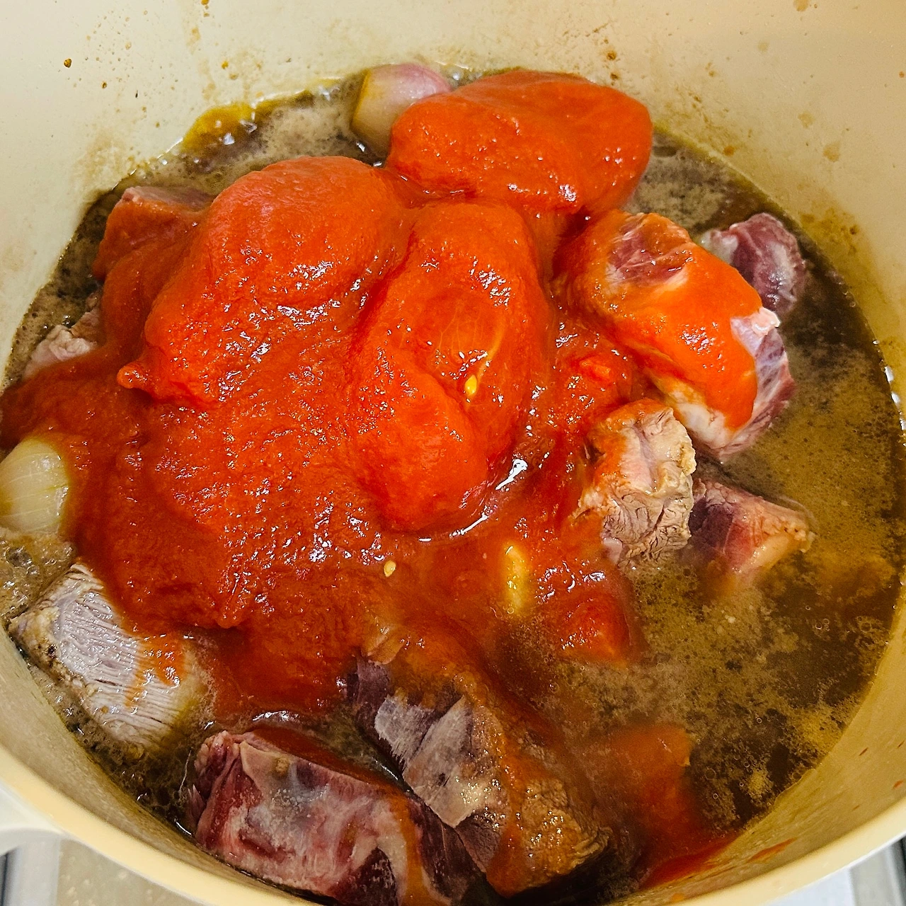 - 치킨스톡과 물, 홀토마토를 넣습니다.