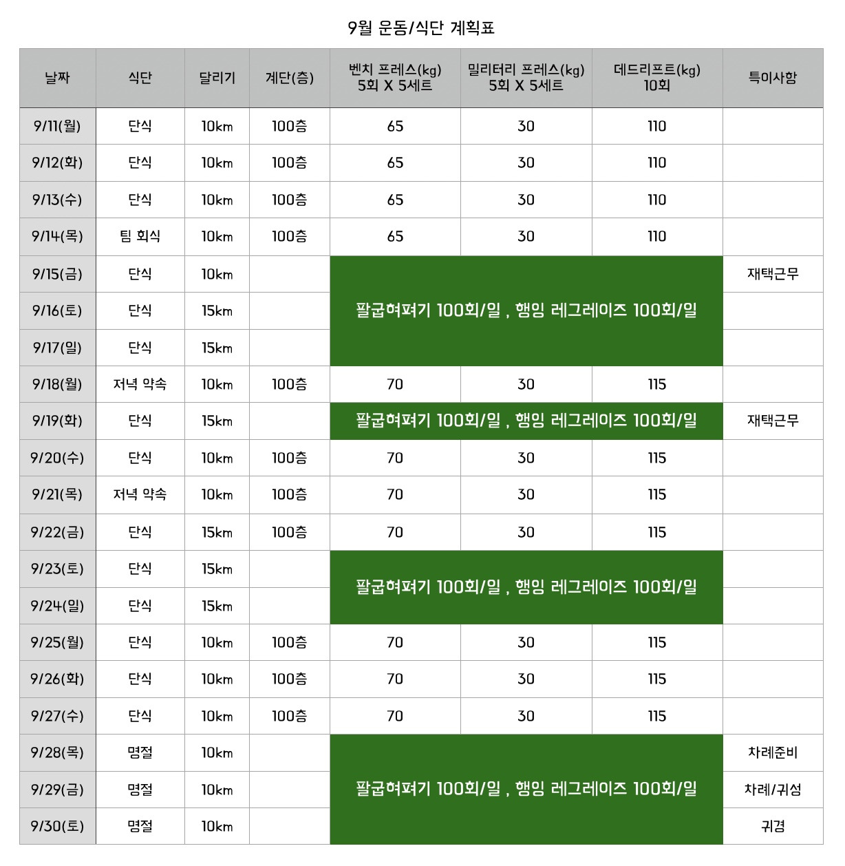 나는 올해 진급을 해서, 3주짜리 진급 휴가를 받은 터라, 추석 연휴부터 시작해 10월 25일까지는 계속 휴가기간이다. 그전까지 올해 마감해야 하는 보고서 3개를 9월 안에 완료해야 하기 때문에, 쉽지 않은 계획이 될 것 같다. 거기에 팀 회식 1회, 저녁 약속 2회가 있어서, 매일의 운동은 조금 강하게 가져갈 예정이다.