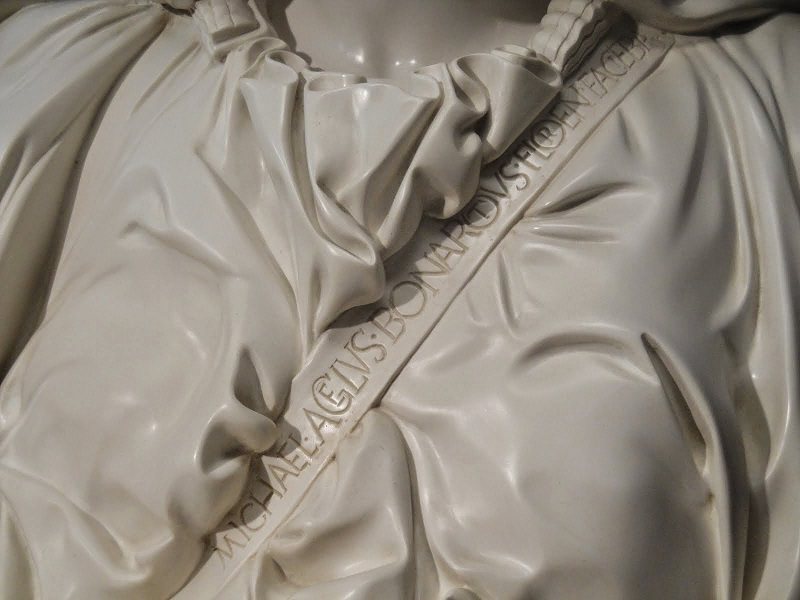 미켈란젤로는 그의 수많은 작품을 미완성으로 끝내고 대다수의 조각들에 서명 또한 남기지 않았는데, <피에타>는 그가 사인을 남긴 유일한 작품이다. 현대의 사람들이 완성된 <피에타>를 보며 감탄하는 것처럼 미켈란젤로 또한 자신의 작업에 상당히 만족감을 느꼈을 것이라는 추측 또한 가능하다. 서명은 마리아의 가슴을 가로지르는 띠에 새겨져 있는 것을 확인할 수 있다.