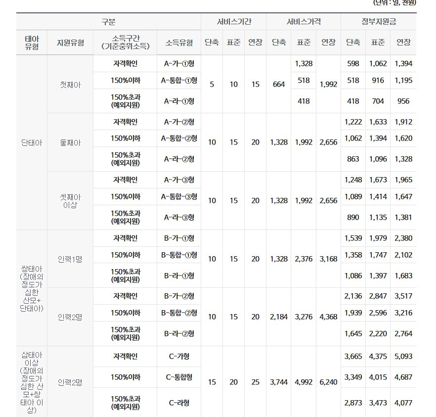 '소득(소득 정도와 맞벌이냐 홑벌이냐 등), 출산 유형(초산, 경산 등), 산모 상황(일반적인 산모인가, 장애나 차명적인 질병이 있는가 혹은 청소년인가 등), 아기 상태(단태아인가 쌍둥이, 삼둥이 혹은 그 이상인가 등)'에 따라 지원 금액과 기간이 다르다.