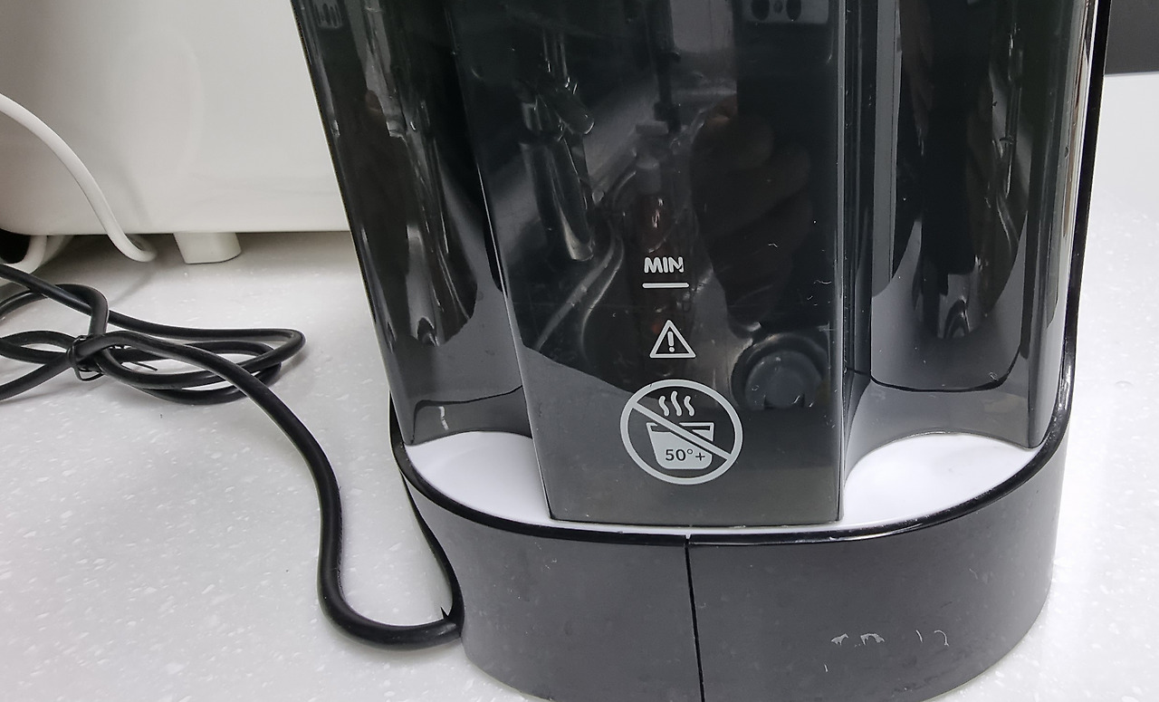 당시 사용하던 분유제조기 뒷면에 부착된 물통. 50도로 식혀 부어둔 물은 시간이 지나며 식게 된다. 그랬다가 버튼을 누르면 먹기 좋은 온도(체온에 가깝게)로 가열해 분유와 섞인다