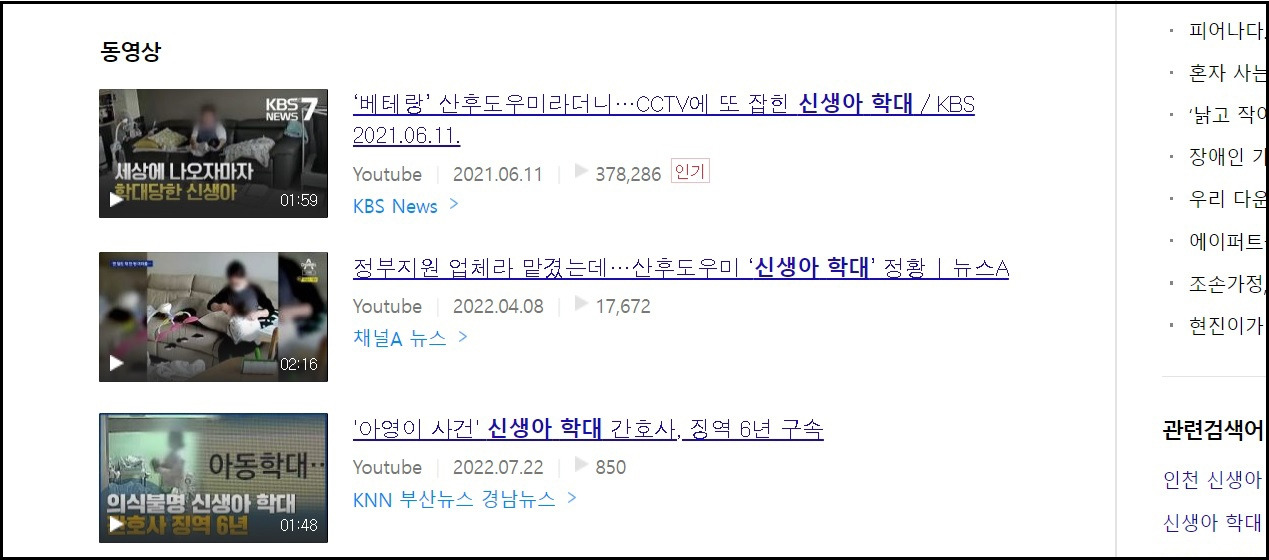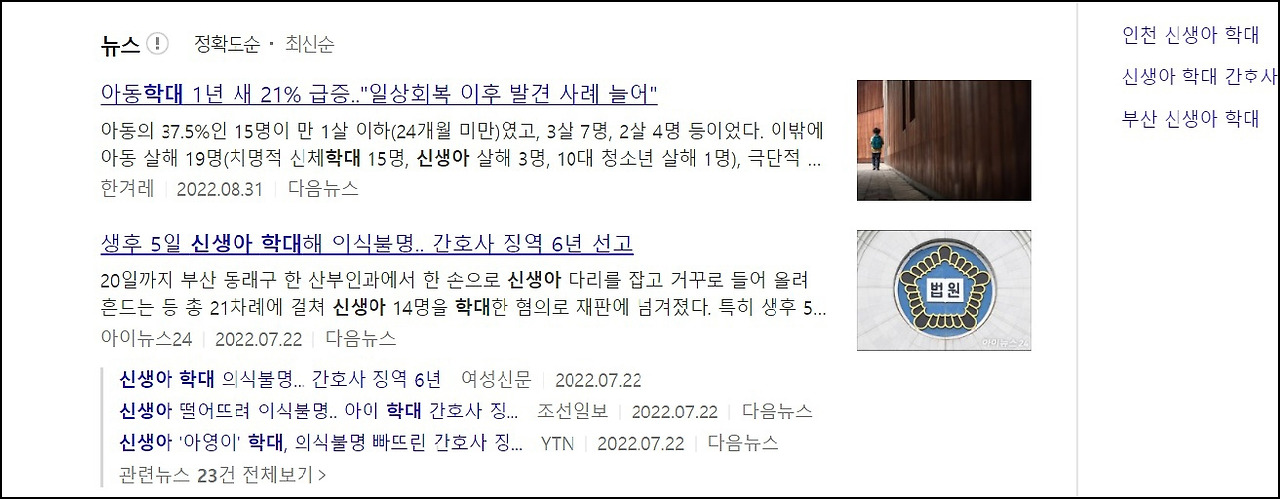 -2022년 9월 4일 오전 7시 30분경 포털사이트에 검색어 '신생아 학대' 결과 화면 캡처