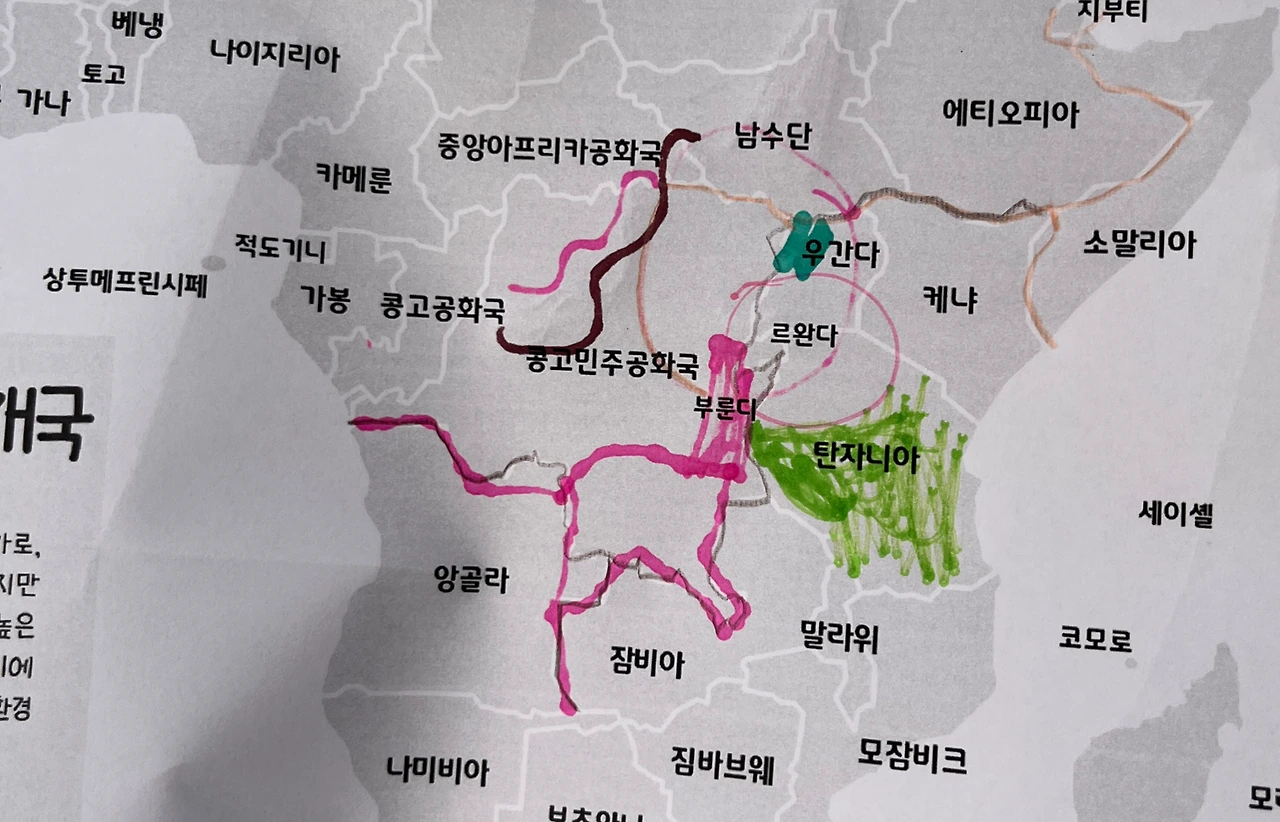 아프리카 대륙 지도 칠하기에서도 재미있는 점이 있었는데, 한국 사람들과 아프리카의 접점에 관한 것이다. 50개가 넘는 아프리카 나라의 국경만 그려진 지도를 주면, 작가들이 따로 설명하지 않아도 어린이와 엄마 아빠가 자연스럽게 서로 이야기 나누면서 먼저 시작하는 나라가 있다. 그 첫 나라, 아마도 그들에게 가장 익숙한 나라가, 어떤 가족에게는 학교에서 아프리카 어린이 편지 쓰기(보통 국제개발NGO들이 후원자 모집과 세계시민교육 차원에서 한다)를 하면서 알게 된 나라이기도하고, 어떤 가족에겐 가까운 친구가 부모님을 따라 이사한 곳이기도 하고, 어떤 가족에겐 엄마 아빠가 결혼하기 전, 엄마가 봉사활동을 가봤던 나라이기도했다. 그걸 보면서 이제는 한국 사람들도 아프리카와의 접점을 생각보다 많이 가지고 있다고 생각했다.