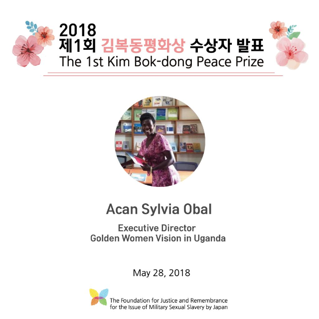 2015년 말, 한일 외교장관이 발표한 한일 정부 간 일본군 '위안부'합의에 반대하고 일본군 성노예제 문제의 정의로운 해결을 위해 발족한 일본군성노예제문제해결을 위한 정의기억재단(이후 정의기억재단)이 지난해 처음 제정한 '김복동 평화상'의 초대 수상자로 우간다의 아칸 실비아 오발(Acan Sylvia Obal)을 선정했다. 정의기억재단은 이 상의 제정이유에 대해 이렇게 설명하고 있다.