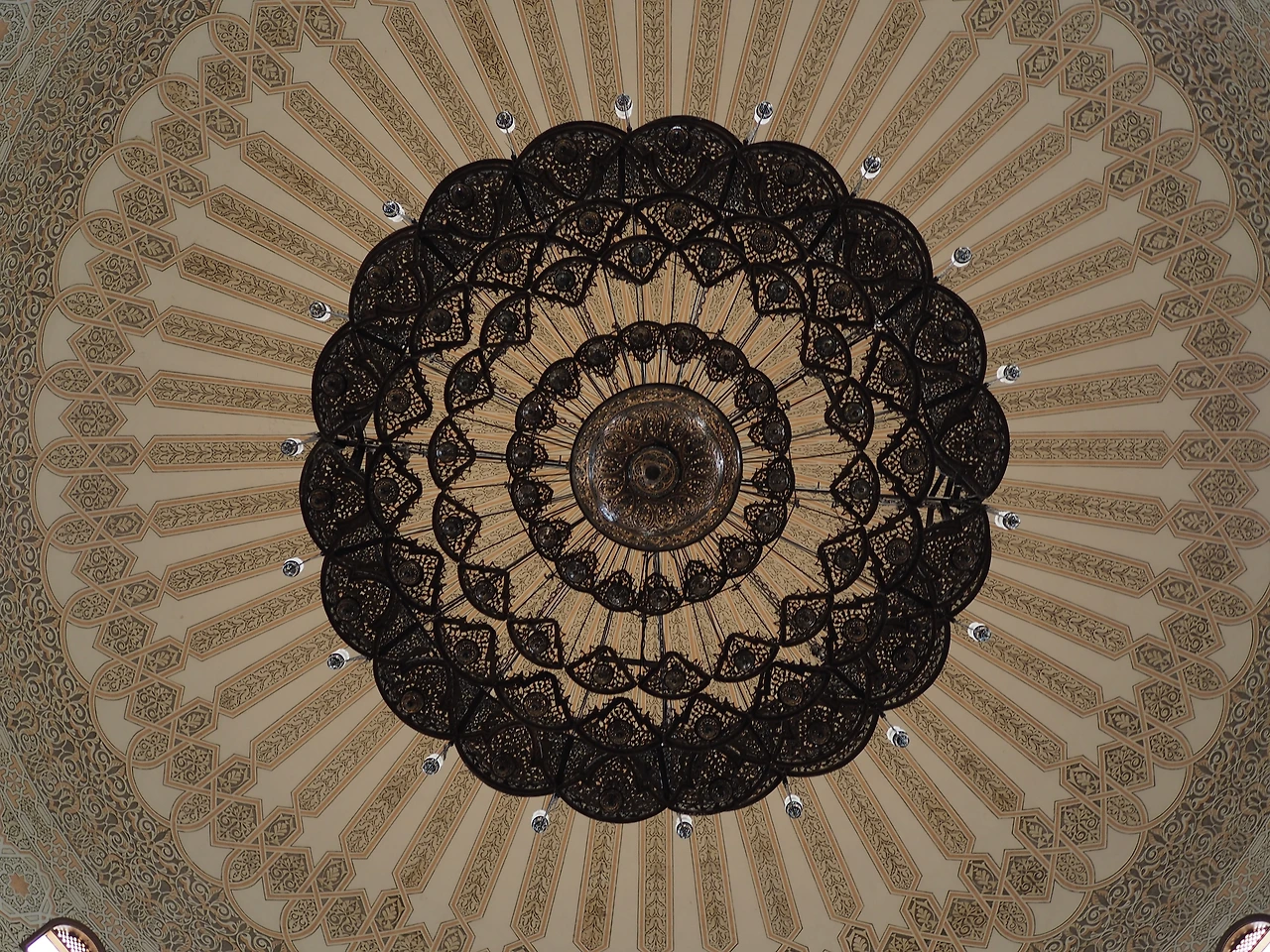 미나렛에서 내려와서는 모스크의 본 건물, 예배당으로 이동했다. 관광객에게도 개방되어 있긴 하지만 여전히 종교적인 곳이기 때문에, 건물에 오르는 계단이 시작하는 곳에서부터 신발을 벗어야 한다. 예배당은 정말 널찍하고 예뻤다. 1만 5천 명 정도가 한 번에 예배를 볼 수 있다고 한다. 처음엔 예배당에서 사진 찍어도 되는 줄 몰라서 그냥 입 벌리고 구경하고 있었는데, 가이드 아저씨가 사진 찍어도 된다고 하셔서 아름다운 건물 내부를 카메라에 담을 수 있었다. 인테리어가 대체로 우아하고 고급스러웠는데, 특히 돔 부분 천장에 달린 거대한 샹들리에가 멋졌다. 예배당에 있는 카펫, 샹들리에, 스테인드 글라스, 미흐랍 등은 터키, 이집트, 이탈리아 등 여러 나라에서 건너온 것들이라 한다.