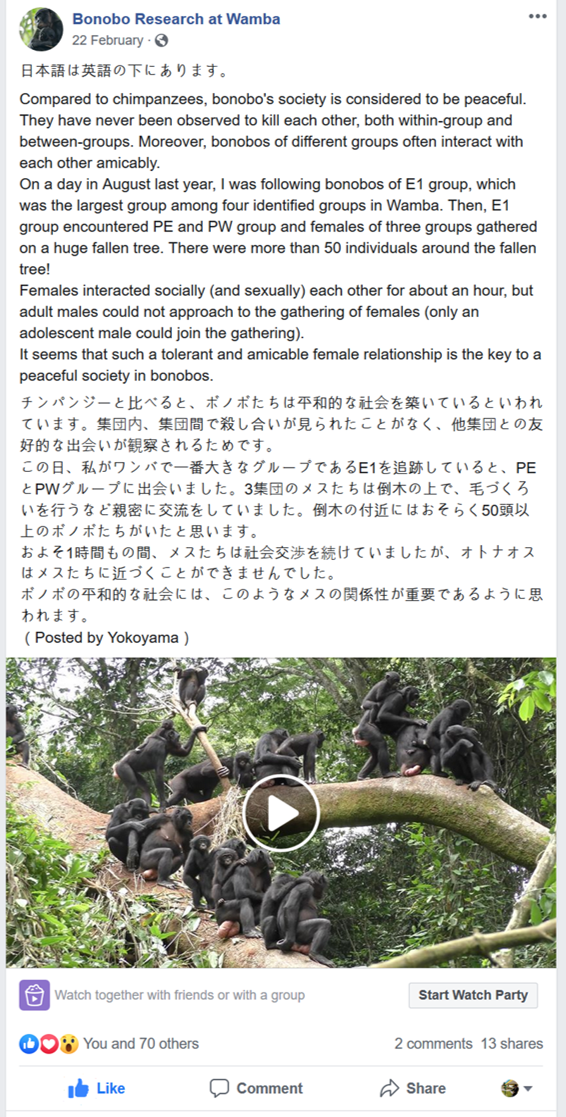 왐바 캠프는 실제로 존재하는 곳인데, 1974년 일본 영장류학자 가노 다카요시가 보노보 연구를 위해 설립했으며, 콩고민주공화국 에콰테르주 밀림에 있다. 현재도 세계 각지의 동물학자들이 보노보 연구를 위해 방문하고 있고, 페이스북 페이지 Bonobo Research at Wamba (https://www.facebook.com/bonobo.at.wamba/)에서 왐바의 연구자들(대부분 일본 출신 연구자)이 보노보에 대해 쓴 글이나 보노보를 찍은 사진을 볼 수 있다. 지난 2월엔 암컷 보노보들의 평화로운 관계에 대한 글도 올라왔다. (번역은 캡처 아래)