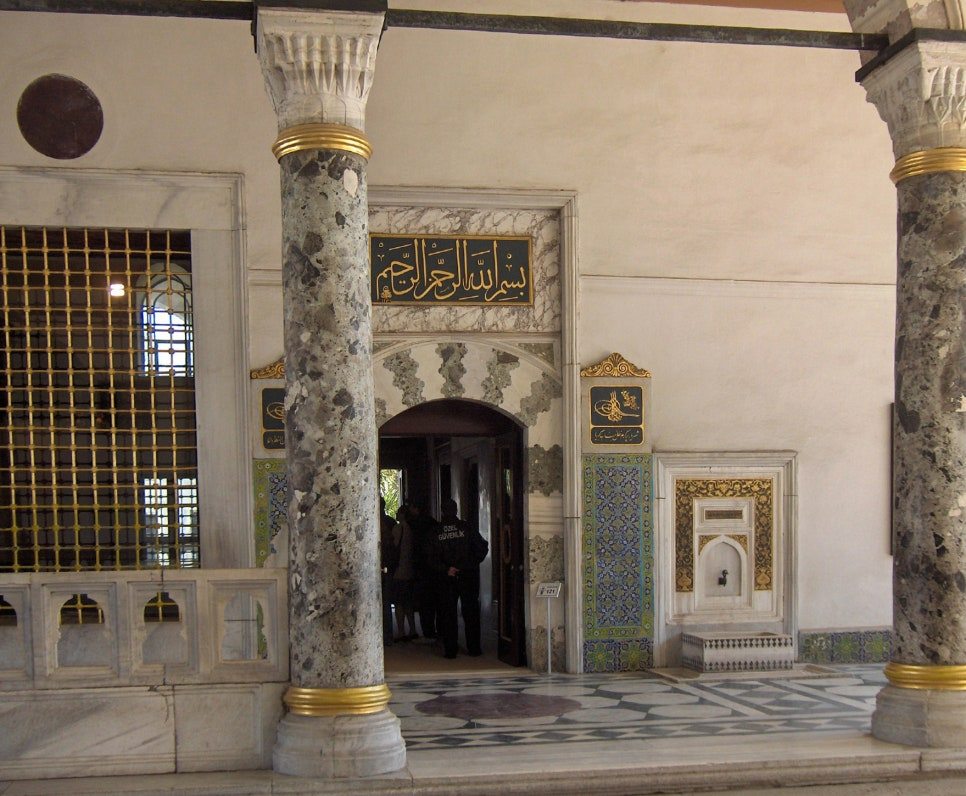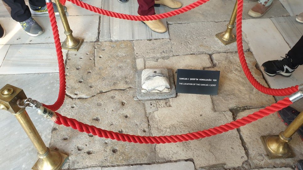 세 번째 문 입구에 과거 산작크 세리프 (Sancak-ı Şerif’in Konulduğu Yer, The Location of The Sancak-ı Şerif)가 게양된 장소를 표시하는 볼록한 돌로 표시된 곳에 붉은 금줄을 쳐 관광객들이 밟는 것을 막아 놓았다. 무함마드의 깃발, 산자크 세리프카 펼쳐진 장소이다. Grand Vizier 또는 전쟁에 나가는 사령관은 엄숙한 의식에서 이 깃발을 받았다고 한다. 산자크 세리프는 이슬람 예언자 무함마드 시대에 사용된 원래 깃발로 무함마드의 수염과 망토 등 다른 신성한 성유물과 함께 네 번째 안뜰에 숨겨져 있다.
