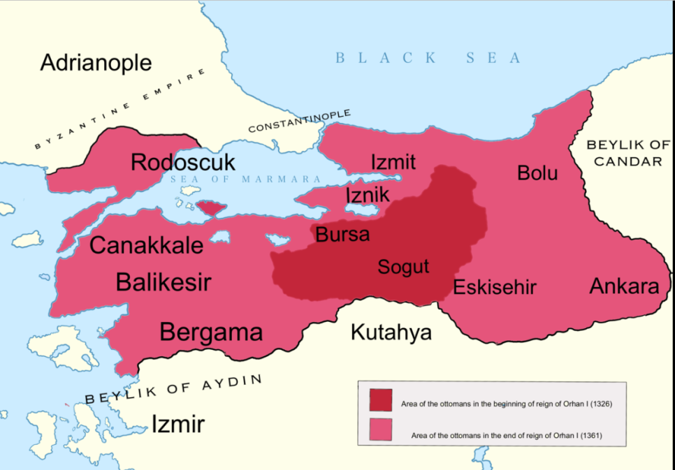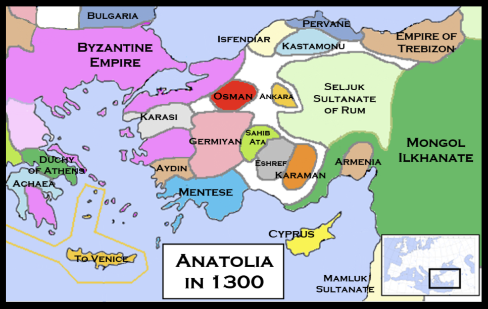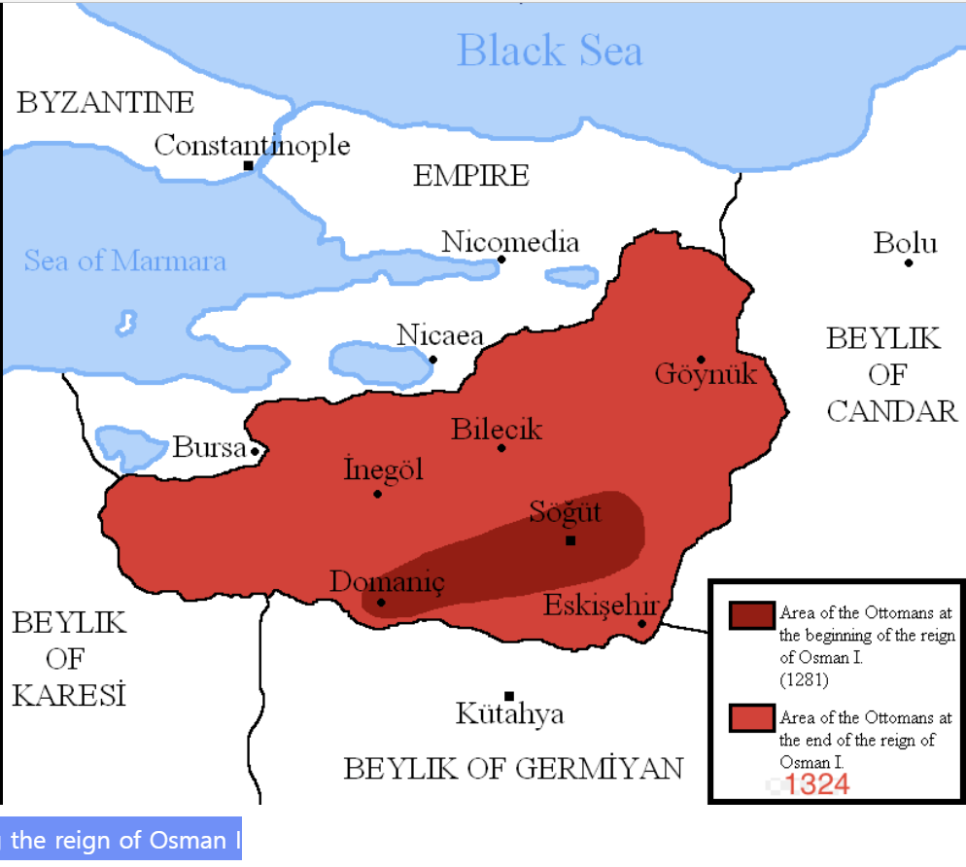 이란 서부 중앙아시아에서 룸 술탄국의 보호를 받으며 살던 약소한 투르크계 유목민 부족은 룸 술탄국과 동로마 제국 간의 전쟁 한가운데에서 살아남기 위하여 룸 술탄국의 용병으로 전쟁에 뛰어든다. 엄밀히 말하자면 자신들의 전쟁이 아님에도, 그저 살기 위해 울며 겨자 먹기 식으로 참전한 셈이다. 물론, 전후에 그 공로를 인정받아 지금의 앙카라 인근 지역의 땅을 봉토로 하사 받아 베이(Bey, 족장)가 되어 약진의 발판을 마련하게 된다. 말이 좋아 베이(Bey)지 여전히 룸 술탄국의 지배권에 속한 속주에 지나지 않았다. 13세기 말경의 이야기다. 11세기말부터 아나톨리아 반도 대부분을 지배한 투르크 왕조 룸 술탄국은 14세기 초인 1308년에 붕괴된다. 이때 베이였던 오스만 가지(Osman Gazi, I. Osmanlı)는 룸 술탄국의 붕괴를 틈타 주변의 동로마 제국 세력을 격파하며 독립을 한다. 이어 1326년 아버지의 죽음으로 베이를 물려받은 아들 오르한 가지(Orhan Gazi)는 그해 전격적으로 동로마 제국의 지방도시 부르사(Bursa)를 점령한다. 당시 오르한 가지의 부르사 점령은 전략적으로 매우 중요한 교두보를 확보한 사건으로 후에 이스탄불과 발칸반도 등 유럽으로 세력을 확장하고 지중해 해상권을 장악하는 오스만 제국의 매우 중요한 전략적 요충지였던 도시이다. 이후 주변의 기독교 세력과 이슬람 세력과의 전쟁과 동맹전략을 구사하며 점차 영토를 확장하고 후에 오스만 제국으로 발전하는 오스만 베이국(Osmanlı Beyliği)을 건국한다.