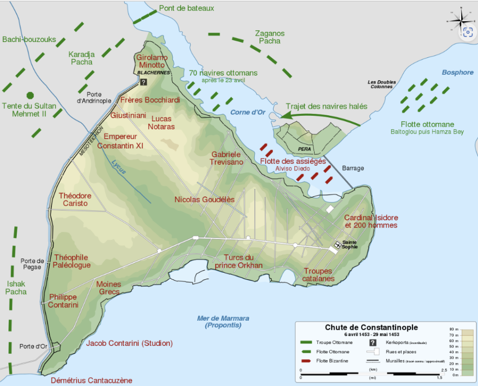 *필자 주) 1453년 콘스탄티노폴리스 정복 전쟁 개전 이전에 오스만 제국의 바예지드 1세(Osmanlı Padişahı I. Bayezid, 1389 ~ 1402)는 1393년 보스포루스 해협 우안(右岸)인 아시아 지역에 아나돌루 히사르(Anadoluhisarı) 요새를 세워 해협을 봉쇄하는 교두보를 확보하였고, 그의 증손자인 술탄 메흐메드 2세(Sultan II. Mehmed)는 1452년 보스포루스 해협 좌안(左岸), 즉 콘스탄티노폴리스 코 앞에 루멜리 히사르라(Rumelihisarı) 요새를 구축하여 흑해 연안의 제노바 식민지에서 보스포루스 해협으로 접근하는 것을 원천 봉쇄하며 확실한 보스포루스 해협 통제권을 확보한다.