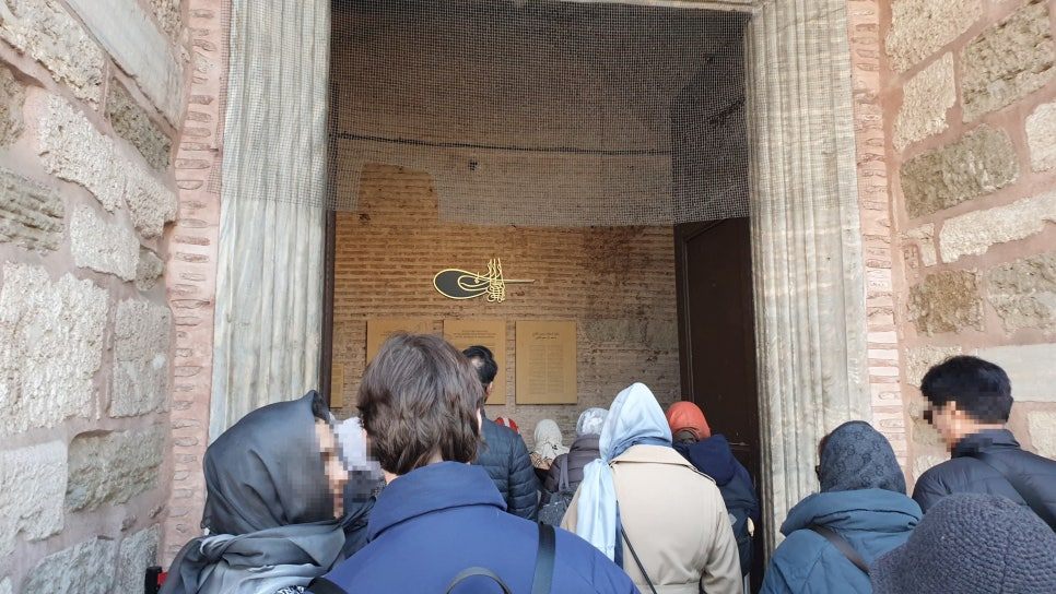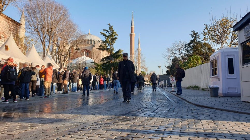 블루 모스크를 보았다고 해야 하는지 모를 어수선한 관람을 마치고 아야 소피아(영어: Hagia Sophia, 튀르키예어: Ayasofya)를 보기 위하여 많은 사람들이 대기하고 있는 줄 끝을 찾아간다. 오전 09시 40분을 지나는 시각인데 이미 많은 사람들이 줄을 서 한참을 내려와 골목 어귀로 꺾어진 줄 끝을 찾아 선다. 그냥 딱 보기에도 고색창연한 유적의 일부로 보이는 담벼락에 정교하게 짠 터키 카펫을 걸어 판매하고 있는 관광지 주변의 상가 골목까지 대기 줄이 이어진다. 지금은 모스크로 사용되고 있는 아야 소피아를 관람하기 위해 모르긴 해도 전 세계 모든 인종이 이른 아침부터 골목을 가득 메웠지 싶다.