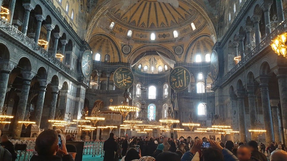 필자가 방문한 모스크로 사용되고 있는 아야 소피아는 회반죽을 걷어내고 일부를 복원한 모습과 아랍어 캘라그라피와 모스크로 개조하면서 추가된 모습이었고 바닥은 녹색 카펫으로 덮여 있었습니다. 2층 3층의 작은 방들은 출입이 전부 통제되어 직접 볼 수 없었습니다. 때문에 몇 년 전까지 만해도 관람할 수 있었다는 아야 소피아의 특징적인 장식은 거의 보지를 못하였고, 중앙 돔 쿠페(Cupola), 중앙 돔을 감싸는 세 개의 큰 벽 이브닝(Eyvān), 모스크로 개조되고 추가된 모습만 보고 온 셈이지요. 아쉬움이 상당히 큰 순간이었지만, 다양한 문화적 변화와 역사적 사건을 거치면서 여러 차례의 수정과 변형을 겪었음에도 불구하고, 다행히 여전히 그 독특한 아름다움을 유지하고 있는 현재의 모습을 보는 것으로 만족해야 했습니다.