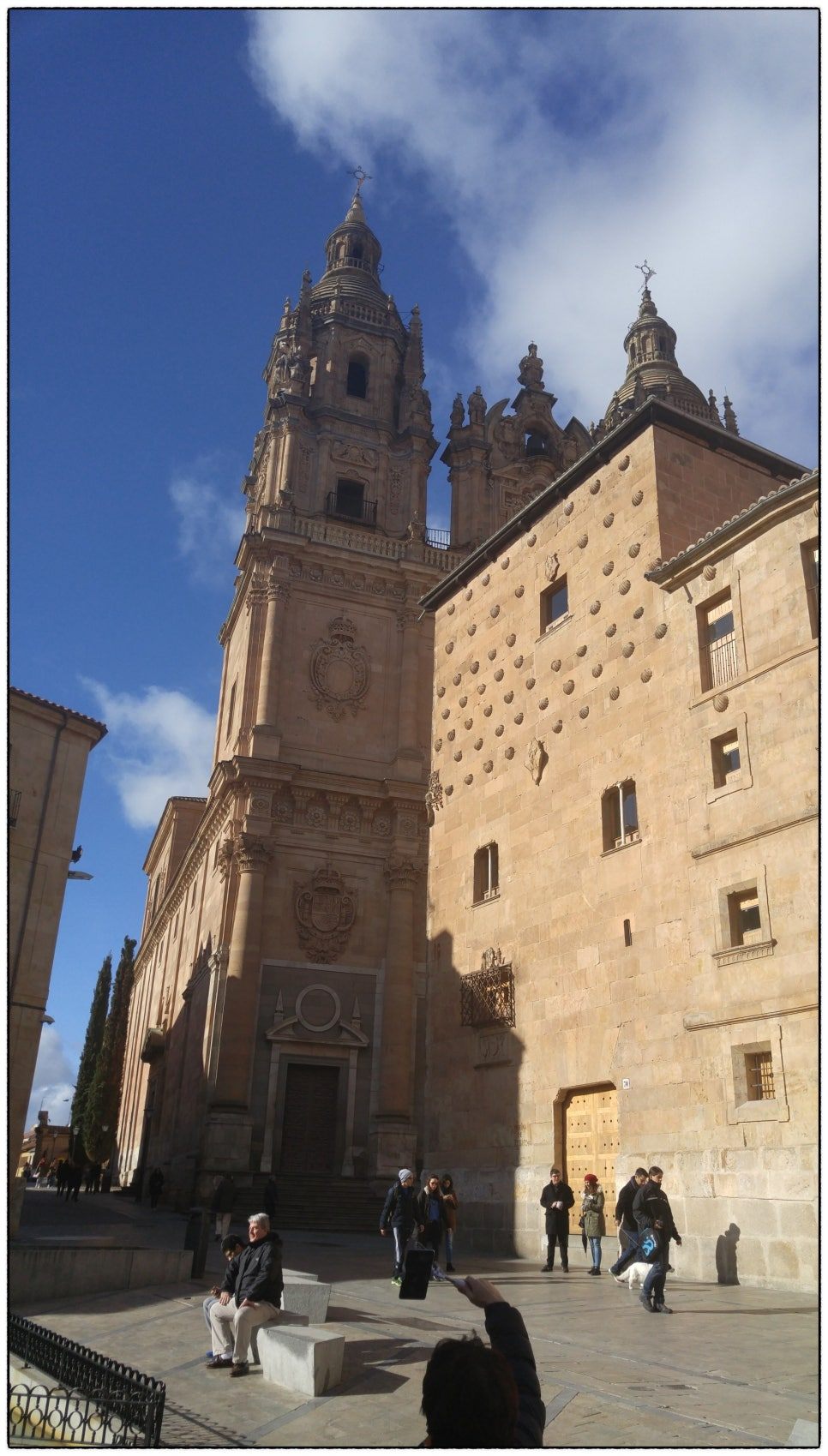 광장에서 잠깐 살라망카 대성당 방향으로 걷다 보니 벽면 상단에 가리비 조개껍질이 잔뜩 붙어 있는 붉은색 건물이 보인다. ‘Casa de las Conchas-조개의 집’이다. 사실 의미를 모를 때 이 집은 그저 좀 특이한 장식을 한 집으로 보였다. 이 건물은 산티아고 데 콤포스텔라 (Santiago de Compostela, Camino de Santiago) 순례자들을 도둑과 이교도, 짐승들로부터 지켜주기 위한 산티아고 기사단 소속의 로드리고 아르얀스 말도나도(Rodrigo Aryans Maldonado) 기사의 저택이었다. 벽 대부분을 성 야곱 성인을 기리면서 그의 상징인 조개로 장식한 것으로 유명한 집이었다. 외관에 조각된 조개는 순례자를 상징하는데 북부지역의 유명한 순례의 길인 산티아고 데 꼼보스텔라 역시 조개로 순례의 방향을 표시했다고 한다.