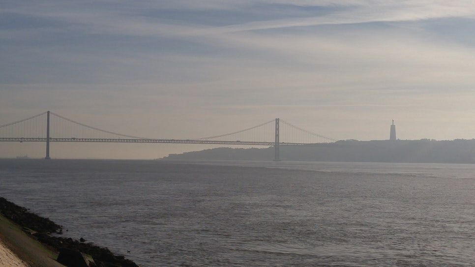 레스토랑 너머로 강을 가로지르는 다리가 흐리게 눈에 들어온다. 어디선가 많이 본 듯한 모습의 이 다리는 미국 샌프란시스코의 금문교와 비슷하게 생긴 ‘4월 25일 다리 Ponte 25 de Abril’로, 현수교의 웅장함이 한눈에 들어온다. 멀리서 바라보니 꽤나 높아 보였고, 높이 솟은 다리는 마치 성냥개비로 만들어 놓은 모형 같아 보인다. 다리는 바다와 만나면서 폭이 넓어진 테주강을 시원하게 가로지르고 있다.