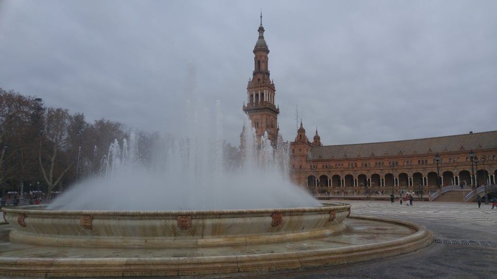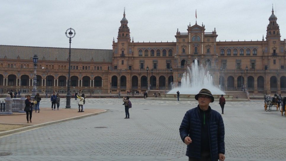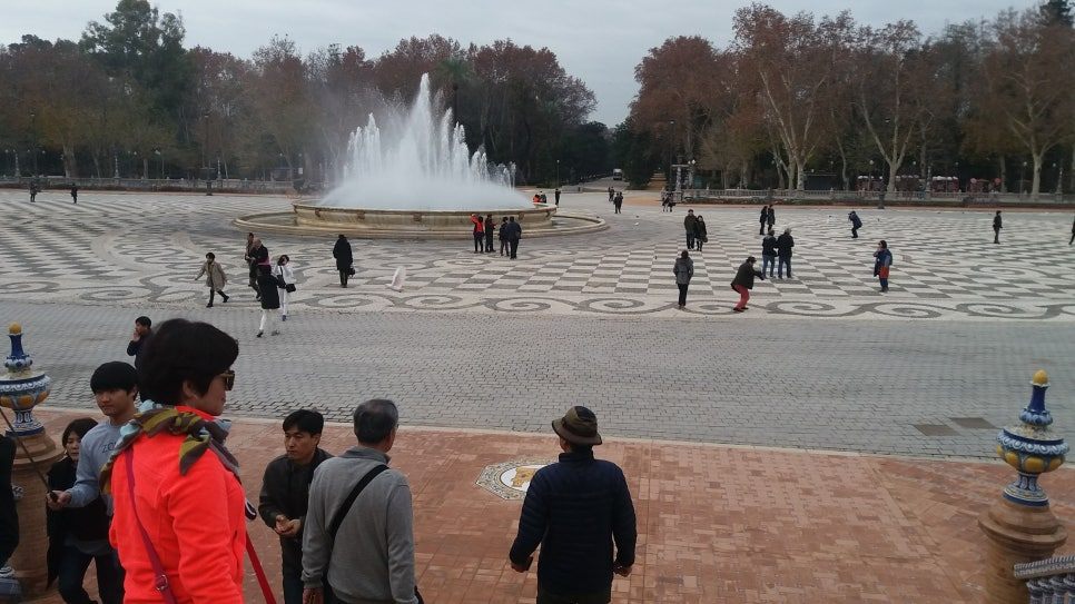 중앙 현관의 아치 너머로 보이는 중앙 분수대에서는 아침부터 물줄기가 힘차게 솟아오른다. 분수대가 자리한 광장 바닥은 수도 없이 많은 작은 돌들이 모자이크처럼 박혀 화려한 문양을 자아내고, 이를 따라 걸어가는 사람들은 저마다 여행의 순간에 깊이 빠져든 모습이다. 광장을 걷는 사람들의 모습이 너무나도 평화롭다. 우리는 완전 좌우대칭이 시작되는 지점에서 정부청사를 배경으로 기념촬영을 한다. 분수대 하얀 물줄기가 힘차게 솟구친다. 해가 진 뜨거운 여름날 저녁에 야간조명과 함께 이 광장을 본다면 또 다른 느낌의 광장을 볼 수 있을 것 같다. 안달루시아 전통 복장의 여인들이 금방이라도 나타나 정열적인 플라멩코를 추며 시끌벅적 축제를 즐길 것 같은 분위기다.
