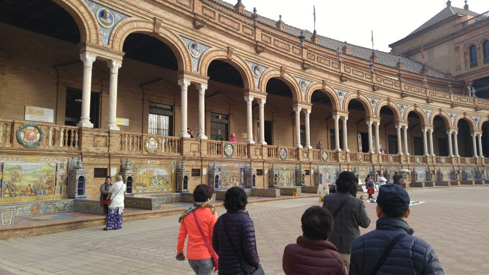 우리는 마리아 루이사 공원 Parque de María Luisa에 인접해 있으며, 대성당 동쪽으로 약 10분 거리에 위치하고 있는 세비야의 가장 인상적인 장소 스페인 광장으로 들어선다. 1929년에 세비야에서 열린 에스파냐-라틴아메리카 박람회를 치르기 위하여 건축가 아니발 곤살레스 Anibal Gonzalez의 설계로 지은 스페인 광장이다. 입구로 들어서는 육중한 출입문과 계단실, 외벽 모두 타일로 장식되어 있다. 아줄레주 Azulejo(타일 그림, 타일 장식)는 이슬람인들의 대표적인 건축 양식이다. 이슬람 양식의 영향을 많이 받았던 세비야다운 건축물이다. 주 출입 현관의 타일 그림과 장식들, 그 자체가 예술이다.