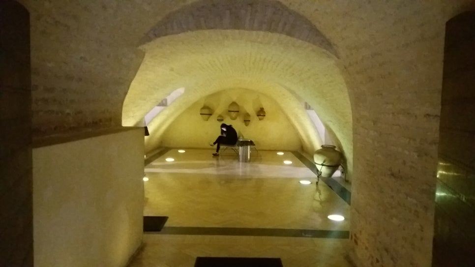 부분적으로 이슬람 양식이 남아있는 성당의 화장실은 어떨까? 별게 다 궁금해진다. 정원을 지나 둥근 돔형 회랑을 따라 화장실로 들어간다. 간접조명으로 은은하고 따스한 느낌을 주는 아늑한 공간이다. 거기에 교과서에나 나올 것 같은 토기가 여러 점 놓여있어 안정감을 주는 분위기다. 화장실 앞의 대기 공간 분위기치곤 상당히 예술적이다. 돔형 통로에는 검은색 스웨터 차림의 소녀가 의자에 앉아 스마트폰을 뒤적거린다. 이거 뭐라 표현해야 하나... 좀 과하게 표현하면 화장실조차도 환상이랄까.