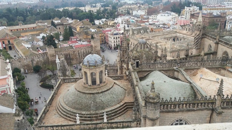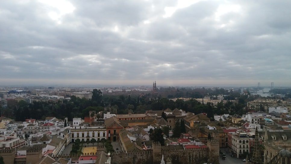 오랜 세월을 견뎌오며 거무튀튀하게 변색된 이끼 낀 성당의 첨탑 뒤로 세비야 시내가 보인다. 히랄다에서 내려다보니 대성당의 엄청난 건축규모가 한눈에 들어온다. 멀리 과달키비르 강까지 시야를 가져간다. 참으로 장관이다. 왕립 투우장과 강변의 엑스포 빌딩도 한눈에 보인다. 알록달록 흰색과 붉은색 노란색이 어우러진 주택가의 모습도 아름답다. 사방 건물들이 빼곡하다. 그러나 고층 빌딩은 없다. 세비야의 시가지는 지중해 햇살을 받아 더욱 아름다운 모습을 드러낸다.