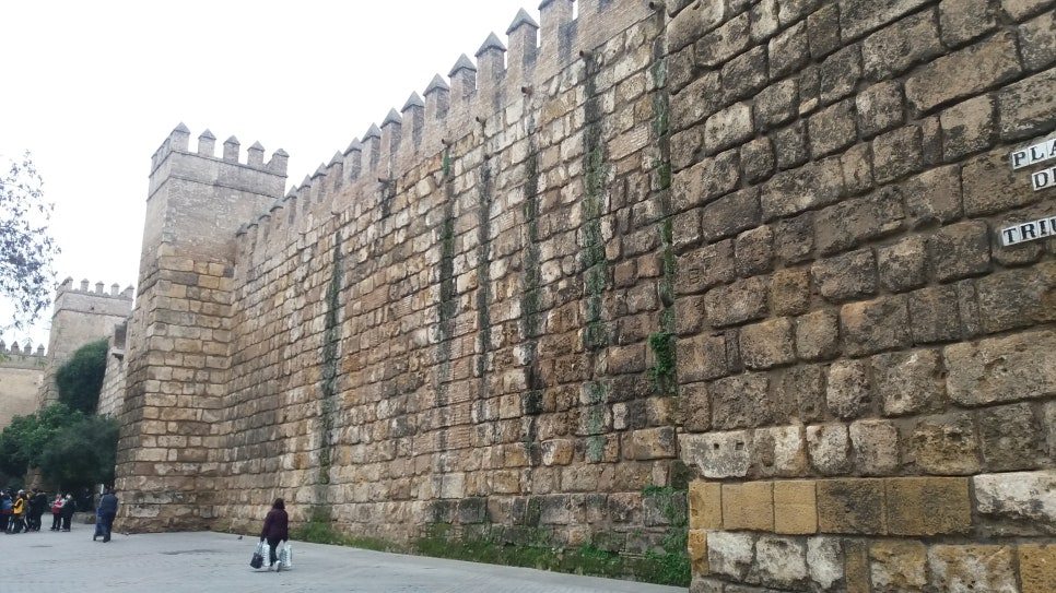 뾰족한 사각뿔 모양의 여장(女墻, 성 위에 낮게 쌓은 담으로 여기에 몸을 숨기고 적을 감시하거나 공격할 때 용이한 담장)과 성벽으로 지어진 성곽 형태의 알카사르 성곽이 보인다. 알카사르와 그 정원은 712년에 무어인들이 이곳을 정복하면서 과달키비르 Guadalquivir 강 주변을 통치하기 시작한 시기에 건립된 으리으리한 요새이다. 1248년 이후 왕실의 거주지가 되었으며, 페드로(Pedro, 일명 ‘잔혹한 왕 페드로’(Peter the Cruel))의 통치 기간에 보수했다. 알카사르의 내부에 건설된 이 궁전은 안달루시아의 아랍 예술에서 장식 표현과 기술을 빌려온 무데하르양식* 특유의 혼합주의를 잘 보여 주고 있다.
