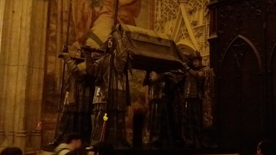 성당 주 제단 옆으로 특이한 광경이 보인다. 네 사람이 관을 메고 서있는 조각이다. 콜럼버스의 묘다. 앞에 꽤 많은 사람들이 몰려 있다. 보통의 경우 성당 바닥이나 벽체 등에 관을 안장하는 것이 정상적이다. 그런데, 왜 관을 땅에 묻지 않고 저렇게 메고 서 있을까? 호기심이 슬며시 고개를 든다. 사연을 들어본다.