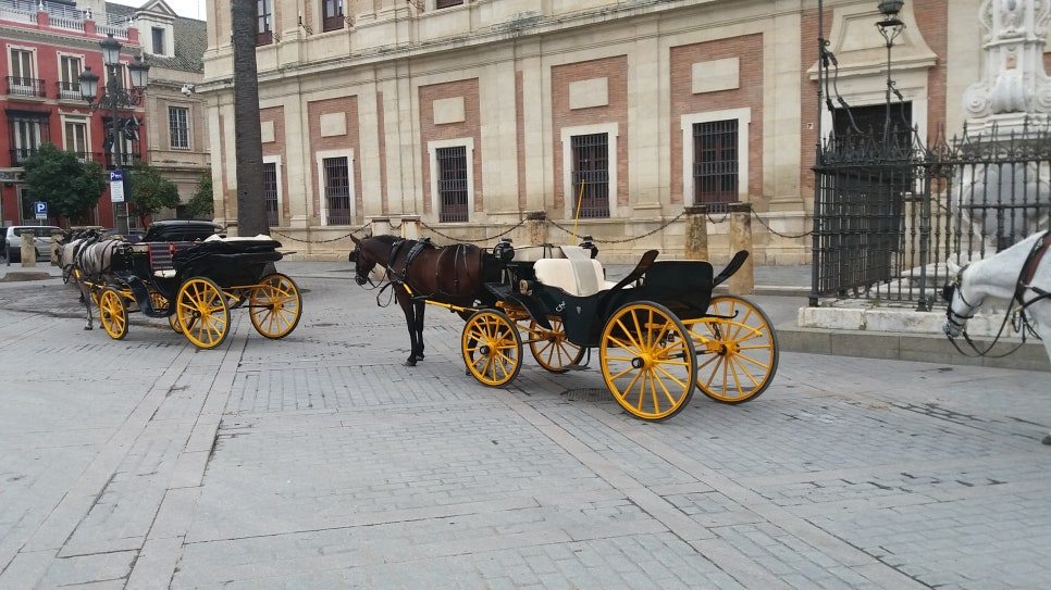 현장학습을 나온 어린 학생들의 재잘거리는 소리는 성당의 벽체에 이내 묻혀버린다. 오늘도 세비야 사람들은 성당 건너편 거리에서 일상을 살아가고 있다. 작고 하얀 트럭이 거리의 휴지통을 비우기 시작한다. 예쁘게 단장한 마차는 관광객을 태우기 위해 성당 앞에서 대기하고 있다. 과거 왕족과 귀족들이 딸각딸각 편자 소리를 흩날리며 호들갑스럽게 타고 다녔을, 중세 귀족처럼 깔끔하고 말쑥하게 단장한 마차는 승리의 광장 한쪽에서 이제 관광객들을 맞는다.
