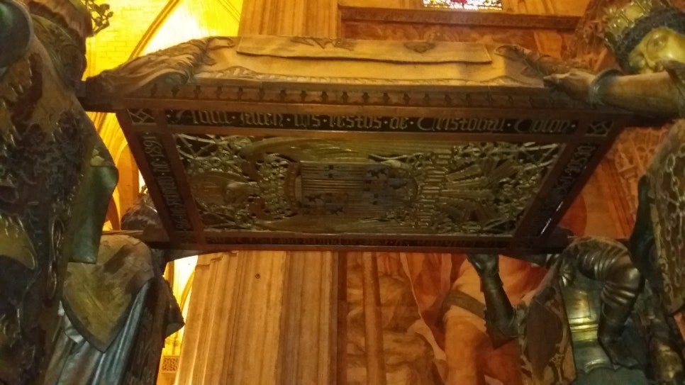 콜럼버스의 유언대로 유해가 스페인 땅에 닿지 않도록 콜럼버스의 관을 4명의 스페인 왕의 어깨 위에 올려놓은 것이다. 카스티야 국왕과 레온 국왕이 고개를 들고 앞에 서 있고 아라곤 국왕과 나바라 국왕이 고개를 숙이고 뒤에서 뒷부분을 잡고 있다. 스페인의 4 왕국 중에서 앞의 두 왕국은 콜럼버스를 지원했고 뒤에 두 왕국은 지원하지 않아 콜럼버스에 대한 존경의 의미로 고개를 숙이고 있다고 한다. 이탈리아 출신에 한낱 항해사에 불과했던 콜럼버스의 신대륙 발견으로 스페인의 번영을 가져왔기에 그의 관을 스페인 왕들이 들고 있다 한다. 까스티야 국왕의 발을 만지면 세비야에 다시 온다는, 웃자고 한 이야기를 들은 여행객들이 까스티야 국왕의 발끝 부분을 하도 만져 이곳을 다시 오고자 하는 사람들의 마음만큼이나 반질반질 빛이 난다. 현재는 만질 수 없다 한다.