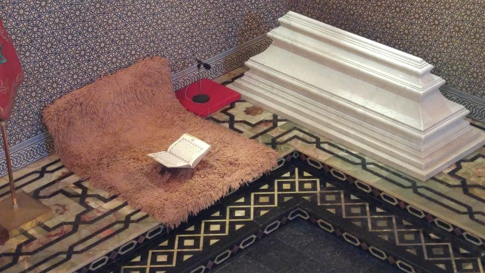 그 흙벽 너머에 섬세하고 정교한 이슬람 전통의 돔형 건축물은 모하메드 5세의 영묘 ضريح محمد الخامس Mausoleum of Mohammed V이다. 핫산 타워 맞은편에 자리한 왕조의 무덤으로 신비한 문양으로 한껏 치장한 아름다운 이슬람 전통의 건축양식으로 지어진 돔 아래 왕조의 무덤이 자리하고 있다. 붉은색 전통 복장이 잘 어울리는 왕실 근위병들이 지키는 모로코 왕조의 무덤이다. 현 국왕의 조부인 모하메드 5세와 그의 아들 핫산 2세의 관이 안치되어 있다. 1912년 이래로 프랑스의 식민통치로부터 항거, 독립운동을 주도하여 온 술탄 벤 유세프는 1956년 프랑스로부터 독립하며 왕위에 즉위한다. 그가 모하메드 5세이다. 그 후 1961년 서거하였으며 7년간 400명의 장인이 투입되어 완성된 이곳에 석관이 안치되어 있다. 무덤을 열어 누구나 들여다볼 수 있게 한, 우리에겐 아주 낯선 이슬람 문화다. 네 방향의 입구에는 소총을 들고 근엄한 자세로 무덤을 지키는 근위병이 여행객의 호기심 어린 시선과 마주한다. 긴 창을 들고 말을 탄 왕궁 근위병들이 무덤주위를 순찰한다.