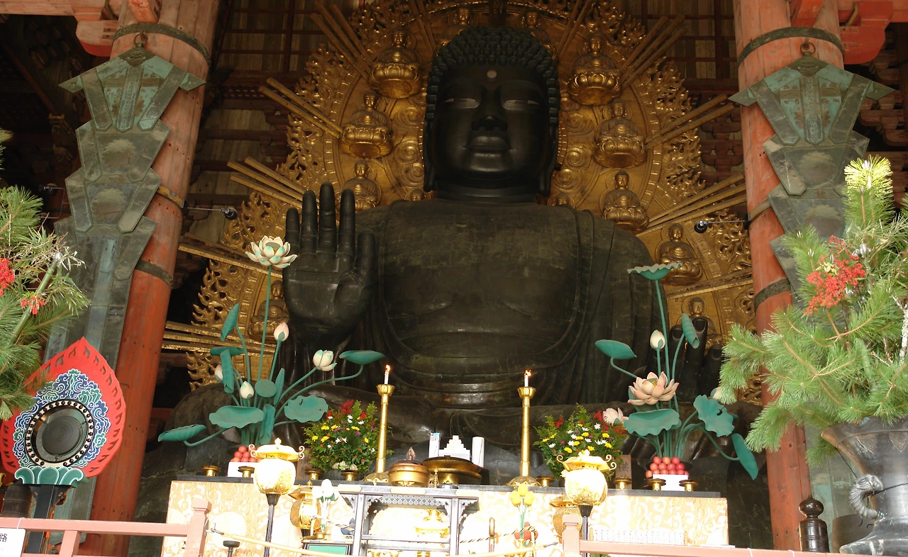비로자나불이 모셔진 대불전(大佛殿)은 높이 48m, 좌우 57m, 앞뒤 50.5m로, 지금도 세계에서 가장 큰 목조건축물로 기록되어 있다. 천천히 고개를 들어 올리며 그 웅장한 지붕을 바라보자, 잠시 숨이 멎는 듯했다.