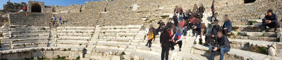 도시가 버려지고 허물어지기 이전의 모습을 상상하며 유적들을 살펴본다. 산자락 끝에 묻혀 있는 석축이 모두 드러나지 않은 채 목욕탕을 지탱하였을 이오니아식 기둥이 남아있다. 현재 눈에 보이는 기둥만 보더라도 상당히 큰 규모의 목욕탕임을 알 수 있다. 헬레니즘 시대에 처음 지어졌고 로마시대에 많은 부분이 확장되어 지어진 목욕탕은 아직 발굴이 완료되지 않은 상태라 한다. 목욕탕 유적지 뒤 나지막한 동산 위를 올려다보니 나무 사이사이로 많은 돌이 흩어져 있는 것이 보인다. 저곳도 아마 아직 발굴전인 미발굴유적지의 일부인 모양이다. 마치 나지막한 동산을 살짝 덮고 있는 듯 드리워진 파란 하늘이 아직 발굴되지 않은 유적지를 살포시 감싸 안고 있는 것처럼 보인다. 튀르키예 관광지 어디에서나 많이 볼 수 있는 견공이 어김없이 관광객들이 오가는 길 위에 길게 누워있다. 그리고 아기를 앞으로 앉은 부부가 안내판의 설명을 읽고 서 있다. 어디선가 나타난 누렁이와 흰둥이들이 유적지를 거처 삼아 지내는지 산 위에서 순식간에 꽤 여러 마리의 견공이 나타나 으르렁거리며 영역다툼에 열을 올리는 광경이 벌어지는데도, 늘 있어왔던 일상적인 일이라는 듯, 수천 년의 세월이 바람결에 느껴지는 유적지 앞으로 청색 유니폼을 입은 관리인이 스마트 폰을 보며 무심히 지나간다.