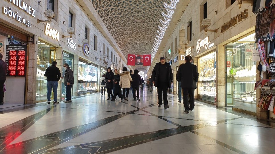 베데스덴, 귀금속 시장부터 농산물 시장인 Tuz Pazarı까지 골목골목을 누비며 재래시장 구경에 도낏자루 썩는 줄 모를 지경이다. 어느 나라를 가든 재래시장 구경은 꽤나 재미있는 일정 중 하나이다. 부르사 그랜드 바자르는 규모가 상당히 큰 시장으로 정말 다양한 제품으로 가득한 시장이다. 조금 과장하여 표현한다면, 바늘부터 비행기까지 다 있을 것 같은 시장이다. 매우 아름다운 문양으로 디자인되어 있는 베데스덴의 천정에 이끌려 부지불식간에 고개를 뒤로 젖히고 올려다보게 된다. 시장 곳곳에 어김없이 붉은 튀르키예 국기가 걸려 있다. 장소 불문, 국기를 이렇게 많이 게양하는 나라가 또 있을까?라는 생각을 하지 않을 수 없을 정도로, 어디에서나 볼 수 있는 초승달과 별이 그려진 붉은 월성기는 오늘도 낯선 여행자에게 강렬한 인상을 남긴다. 필자가 시장을 찾은 시간은 오전 10시 30분경, 시장 구경치곤 좀 일찍 나온 감이 없지 않은 이른 시간임에도 적지 않은 사람들이 시장통을 오간다. 일찍 문을 연 상인들이 삼삼오오 모여서 뭔가를 이야기하는 모습, 다른 이슬람 사회와 달리 일찍이 히잡 등 이슬람 여성 복장에서 해방된, 실크 수건으로 머리를 감싼 튀르키예 여성들, 쇼핑백을 들고 베데스덴을 오가는 사람, 캐리어를 끌고 가는 여행자, 상품 박스를 운반하는 상인, 청소차를 밀고 가는 근로자, 환전소에서 외화를 바꾸는 사람들까지 실로 다양한 얼굴의 사람들이 이른 시간 시장을 찾았다. 아마도 사람들이 시장을 찾기 시작하는 오후가 되면 엄청난 인파로 북새통이 될 것 같다. 반짝반짝 빛나는 쇼윈도에 진열된 금 은 보석만큼이나 많은 사람들의 사연이 얽혀 있을 법한 수백 년 역사를 이어온 시장, 그렇게 부르사 Kapalı Çarşı(Grand bazaar)를 오가는 사람들을 구경하는 재미에 빠져든다.